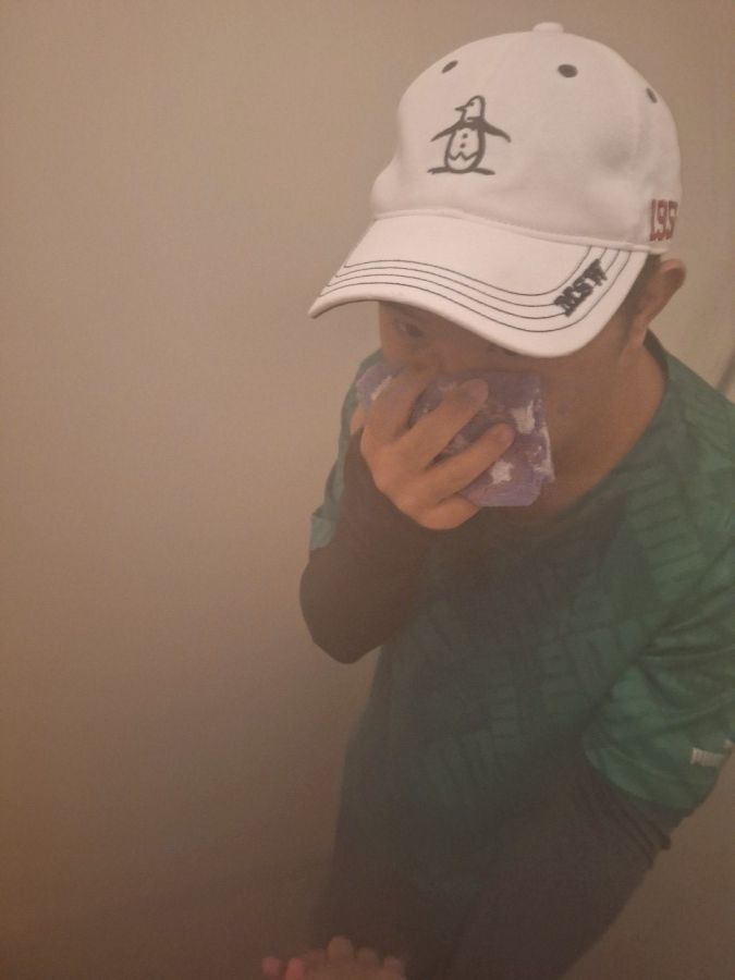 煙を吸わないようにハンカチで鼻と口を押えて避難